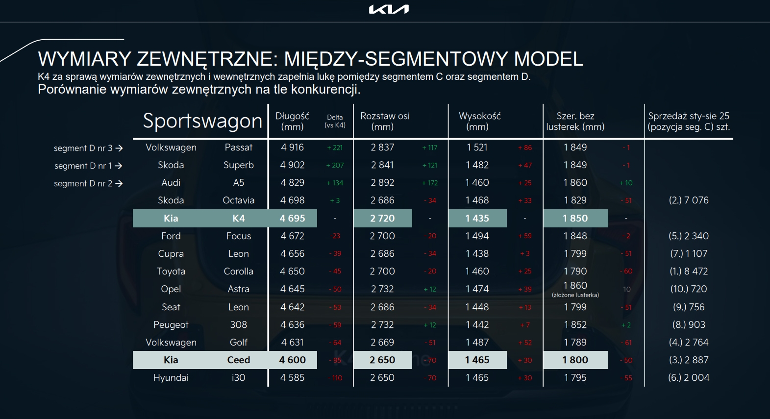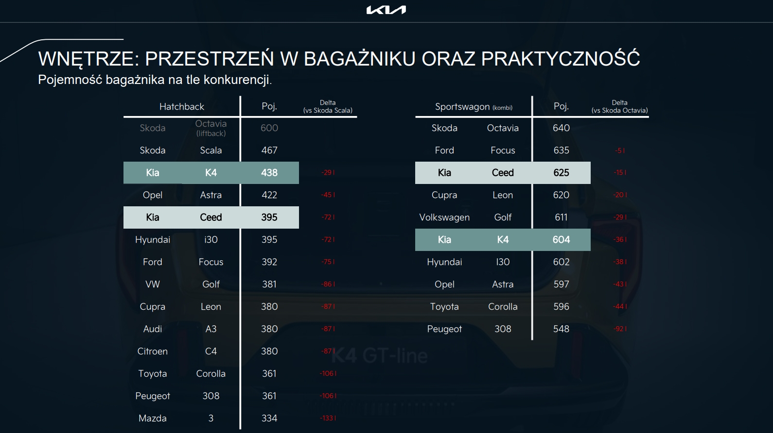 Sportwagon zachowa nowoczesny, dynamiczny styl znany z K4 Hatchback, ale otrzyma wydłużoną linię nadwozia i bardziej pojemną część bagażową. Charakterystyczne agresywne reflektory, wysoka linia pasa i nowoczesny tył z pełną listwą świetlną sprawiają, że auto wygląda jednocześnie sportowo i elegancko.
